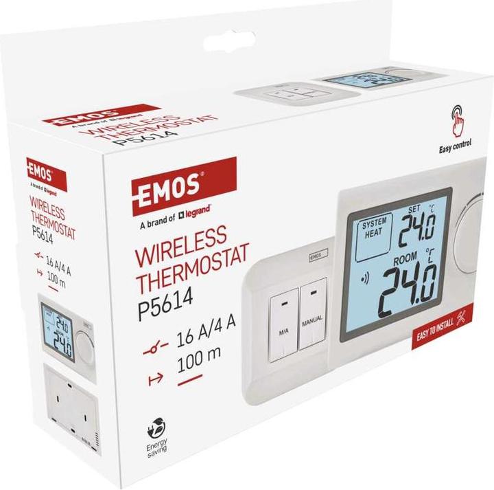 Sobni mehanski brezžični termostat EMOS P5614 omogoča enostavno in natančno nastavitev temperature od 5 °C do 35 °C brez potrebe po kablih. Ima velik, osvetljen zaslon, doseg do 100 m in je primeren za ogrevanje ali hlajenje v hišah in stanovanjih.